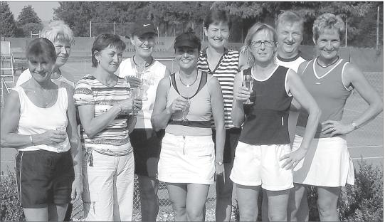 Die Tennisspielerinnen des TC Rübenach sind in die Verbandsliga der Altersklasse 40 aufgestiegen. Nach ihrem zweiten Platz in der Rheinlandliga gewannen die Rübenacherinnen das Relegationsspiel gegen BASF Ludwigshafen mit 6:3 und machten somit den Sprung in die höhere Spielklasse perfekt. Das erfolgreiche Team spielte mit (von links) Gisela Simonis, Gerlinde Busch, Karin Schulz, Hannelore Krauthakel, Astrid Kriebs, Renate Malottke, Marita Luxem, Trainer Hans–Willi Koch und Angelika Homann. Es fehlt Marie–Teres Lehnen.