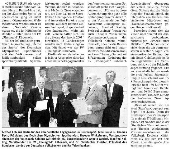 Bundeskanzlerin überreichte dem Verein eine Auszeichnung für besondere Verdienste um den Sport