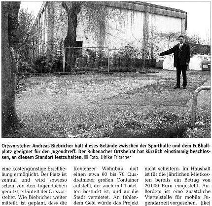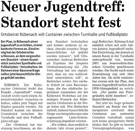 Rübenacher Ortsbeirat treibt das Projekt „Jugendtreff“ voran. Anstatt weiter noch Alternativen Ausschau zu halten, sollen jetzt Nägel mit Köpfen gemacht werden. Rhein Zeitung – 03.02.2009