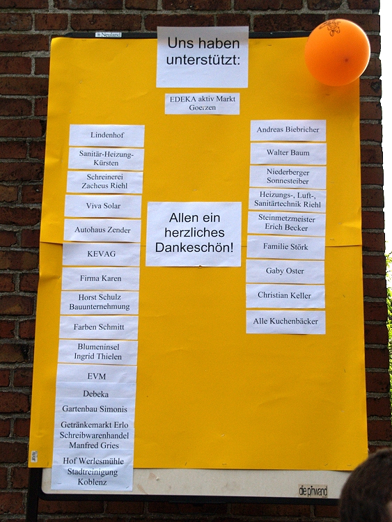 Ohne die Hilfe unserer Sponsoren und den vielen Helfern im Hintergrund wäre es uns nicht gelungen, ein Zeichen gegen den Klimawandel zu setzen. Hier wollen wir uns ganz besonderes bei dem Paten unserer Aktion, Herrn Dirk Goerzen bedanken. Er hat nicht nur für unser leibliches Wohl gesorgt, sondern stand uns auch immer mit Rat und Tat zur Seite. Unser Dank gilt aber auch noch ganz besonders den hauptamtlichen der Pfarrei, dem Schützenverein, der die Bänke und Tische „spendiert hat“, Herrn Biebricher, der seine Kontakte zu Land und Leuten hat spielen lassen, dem Team vom Lindenhof, der Firma Kürsten, die sich um die Klimaausstellung gekümmert hat, und der Schreinerei Riehl. Das sich so viele in Zeiten schlechter Wirtschaft für soziales Engagement einsetzen ist nicht selbstverständlich.