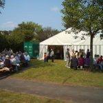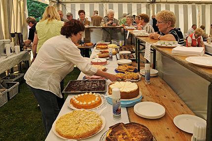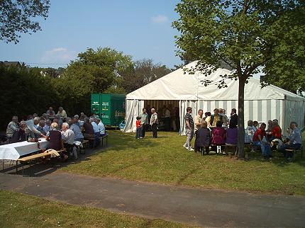 Nachdem durch den aktiven Chor ein kleines Ständchen dargebracht wurde und der schlimmste Durst gestillt war, ging es weiter zum Festzelt des Männerchores. Dort war bereits für Essen und Trinken gesorgt, damit die Wandergesellschaft nach der „anstrengenden“ Tour sich wieder richtig erholen konnte.