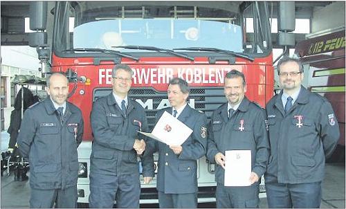 Eine besondere Ehrung haben Einheitsführer der Freiwilligen Feuerwehr Koblenz entgegengenommen. Stadtfeuerwehrinspekteur Branddirektor Wolfgang Schröder (Bildmitte) gratulierte (von links) Thomas Hüllen von der Einheit Horchheim, Jens Vogel von der Einheit Kesselheim, Udo Güttner von der Einheit Rübenach und Bernward Huptas von der Einheit Neuendorf. Die Kameraden erhielten für besondere Verdienste um das Feuerwehrwesen das Silberne Feuerwehrehrenzeichen am Bande vom Minister des Innern und für Sport des Landes Rheinland-Pfalz, Karl Peter Bruch. Im Rahmen der Delegiertenversammlung des Stadtfeuerwehrverbandes Koblenz überreichte Bürgermeisterin Marie-Theres Hammes-Rosenstein die Auszeichnungen