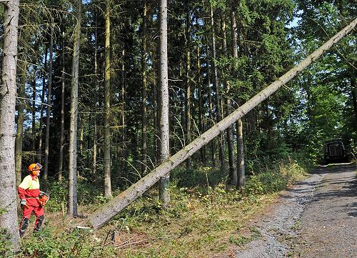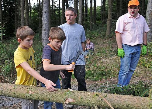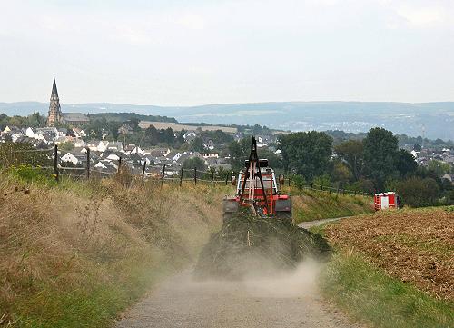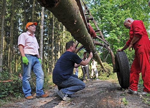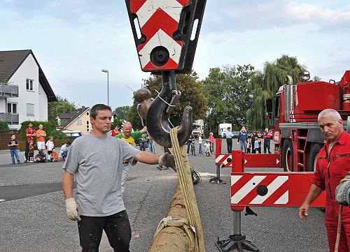 Eine Woche vor Kirmes stellt in Rübenach die K.u.K. auf dem Schulhofparkplatz mit Hilfe eines Kranwagens und Unterstützung der Freiw. Feuerwehr den Kirmesbaum auf. Fotoimpressionen von der Aktion von Heinz Köhmstedt.