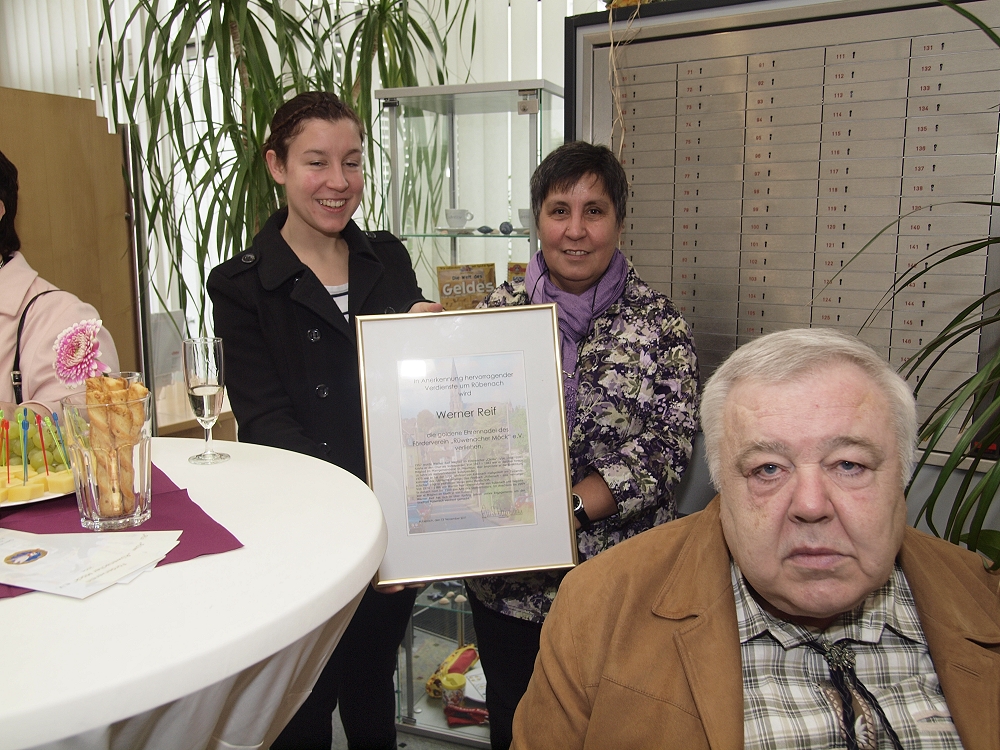 Zum 8. Mal wurde die Ehrennadel “Goldene Möck” an einen verdienten Rübenacher verliehen. In einer Feierstunde in den Räumen der Sparkasse Rübenach, wurde Werner Reif für sein langjähriges Engagement um unseren Stadtteil, durch den Förderkreis “Rüwenacher Möck” e.V. unter viel Applaus der Anwesenden ausgezeichnet. In ihrer Laudatio hob Vereinsvorsitzende Marion Lipinski-Naumann noch einmal die Verdienste von Werner Reif hervor.