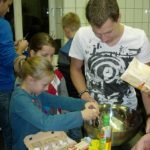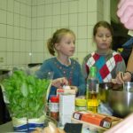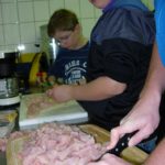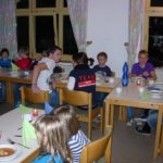 Um 18.00 Uhr begann die Aktion. Tomaten mussten gewürfelt, das Fleisch geschnitten und der Spätzleteig geschlagen werden. Das große Highlight war der Kampf mit den Zwiebeln, der zu manch tränendem Auge führte. Aber das leckere Essen entschädigte für diese Strapatzen. In diesem Jahr gab es das Kinderdinner zum ersten Mal auch mit gemeinsamer Übernachtung. Nachdem noch ein paar Filme gezeigt wurden, schliefen die jungen Lafers dann ein.