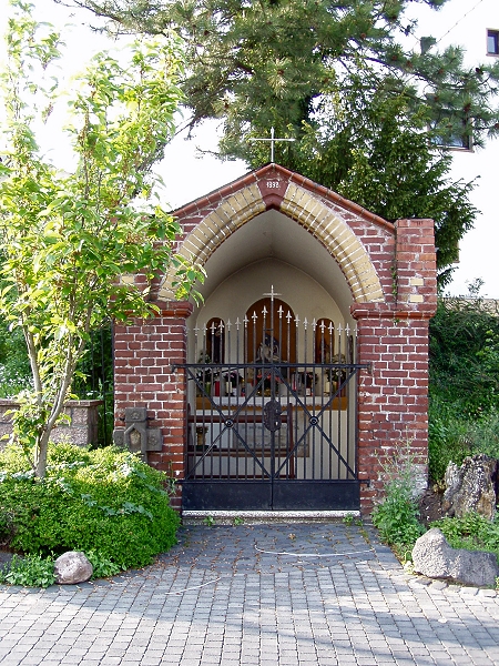 Viel älter als das Marienhäuschen ist das unmittelbar danebenstehende Steinkreuz. Die Kreuzarme sind mit einem Rosettenornament verziert. Das Alter dieses Bildstocks lässt sich nur mutmaßen, es könnte ins 16. oder 17. Jahrhundert zurückreichen.