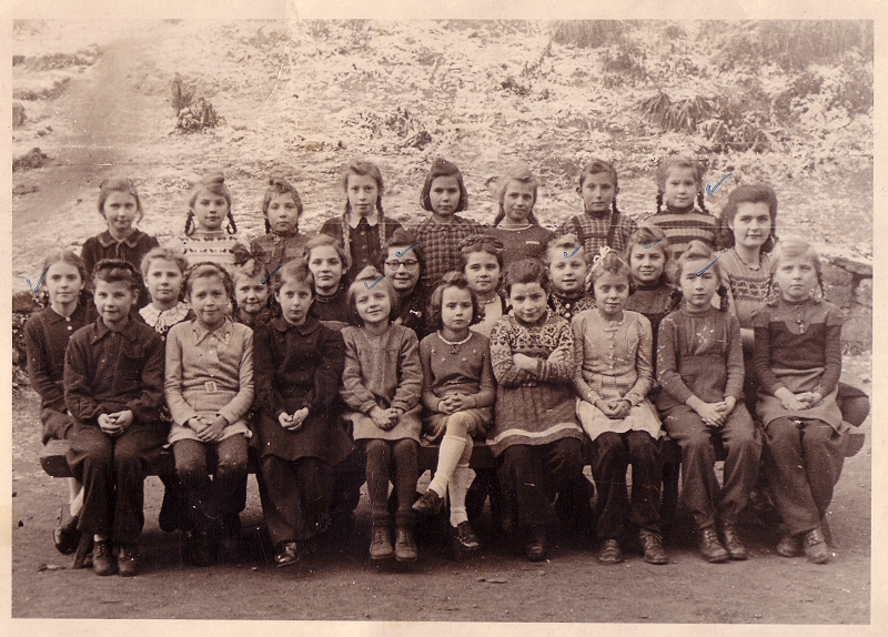 2. Reihe: Inge Schmitz, geb. Reck; Brigitte Wexler, geb. Theiser; Inge Struth, geb. Krey; Christa Hoffmeier, geb. Zerwas; Edith Vogel, geb. Zerwas; Marianne Schüller; Kläre Israel geb. Stier; Hedi Mohrs, geb. Bretz; Magdalene Schummer, geb. Breiden; Helga Müller, geb. Bubenheim; Lehrerin Frl. Juchem