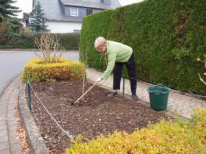 „Hier stand mal ein Baum, der ist aber abgestorben. Die Stadt hat ihn zwar entfernt, aber die Wurzel blieb drin“, so Frau Kolmer. „Als dann niemand mehr kam um sie zu entfernen, haben wir sie halt selbst raus gemacht“.
