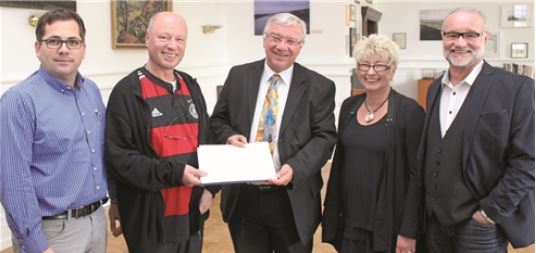 Dirk Goerzen, Bernd Goerzen, OB Prof. Dr. Joachim Hofmann-Göttig, Marion Lipinski-Naumann und Fritz Naumann bei der Übergabe der Unterschriften. (v.l.) Foto Stadt Koblenz