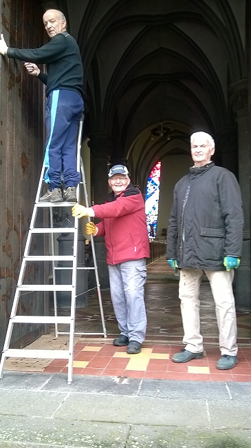 Diese fleißigen „Heinzelmännchen“ Alfred Knöll, Hermann Zils und Günter Röser, wurden am Donnerstag an unserer Pfarrkirche St. Mauritius gesichtet. Der Jahrgang 1940/41 hat sich zur Aufgabe gemacht, die Kirchentüren wieder herzurichten. Es wird fleißig gepinselt und wenn die sandgestrahlten Beschläge wieder befestigt sind, sieht es bestimmt toll aus.
