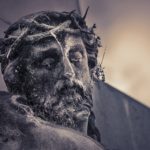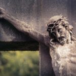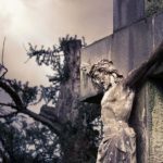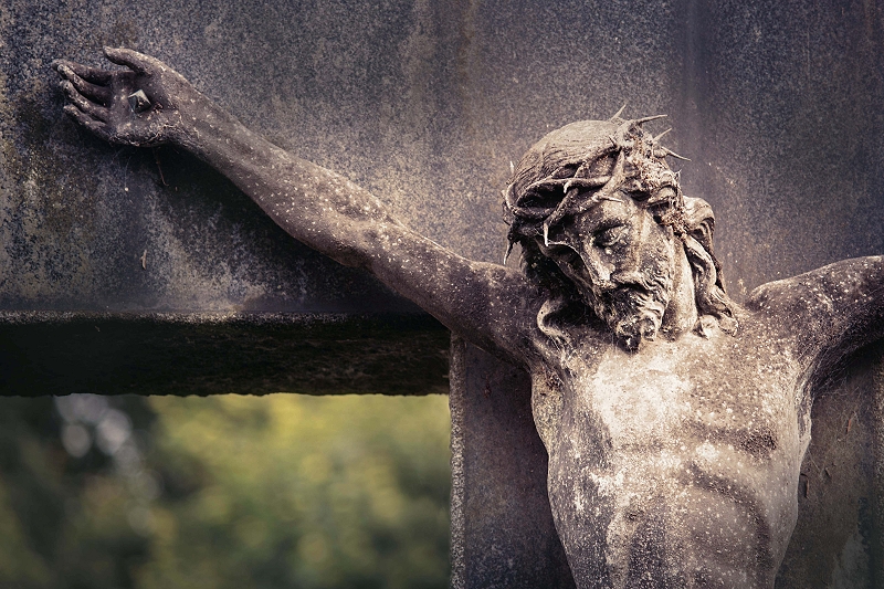 Soll keiner sagen, die derzeitige Wetterlage sei schlecht. Sie ist geradezu dafür gemacht, Orte wie das kahlgeschlagene Pastorengrab hinter unserer Pfarrkirche in Szene zu setzen. Und was soll man sagen: kaum sind die schönen alten Bäume (sicher aus Sicherheitsgründen?) der brachialen Axt erlegen, da kommt zum Vorschein, dass der Zahn der Zeit auch am Herrgott nagt. Einst umgeben von sattem Grün zeigt sich nun zwischen knorrigen, kahlen Baumstämmen, dass sein Gesicht nicht nur zerschunden, sondern auch nahezu zugesponnen ist.