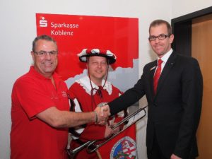 Am Freitag, 18.11.2016 begrüßte Christian Neander, Leiter der Sparkasse Koblenz Außenstelle Rübenach, den Vorsitzenden der Kirmes- und Karnevalsgesellschaft Rübenach Goswin Geisen, sowie Marc Stawovy vom Fanfarenzug. Herr Neander überreichte zur Freude der K.u.K. eine Spende in Höhe von 2200, – Euro. Diese soll für den Wiederaufbau des Fanfarenzugs verwendet werden. Goswin Geisen bedankte sich recht herzlich bei Christian Neander für die großzügige Spende der Sparkasse Koblenz, denn dadurch ist es möglich, den Fanfarenzug entsprechend zu unterstützen, um neue Instrumente und andere Utensilien zu kaufen.