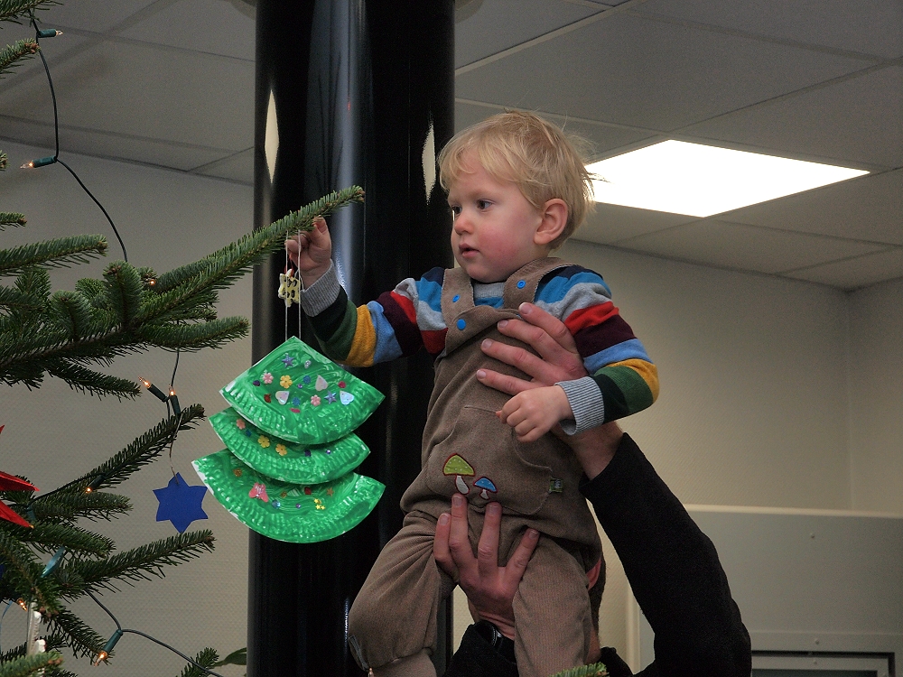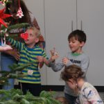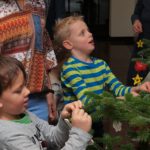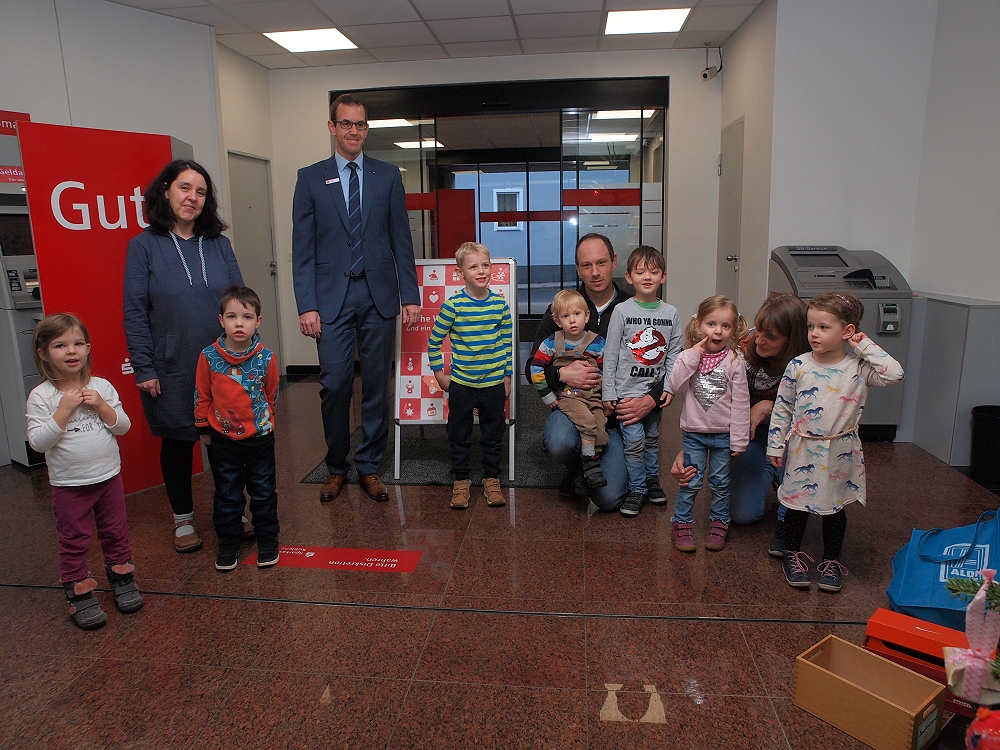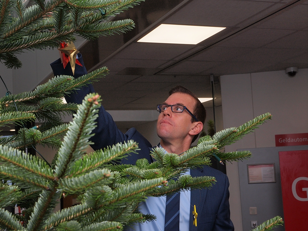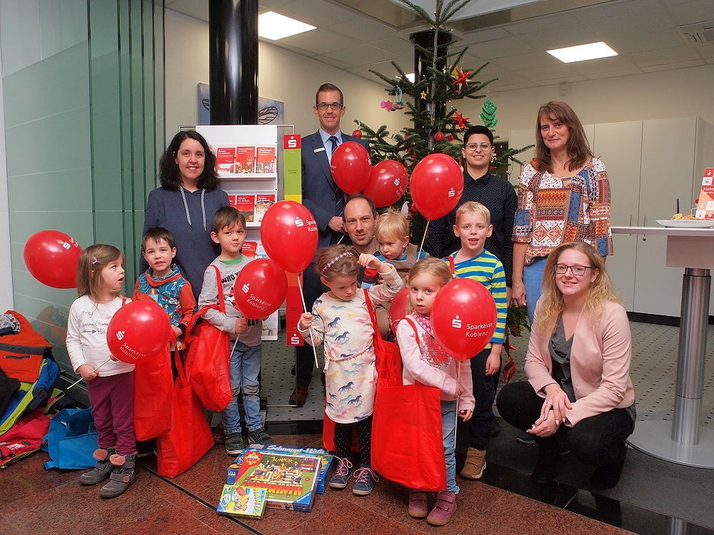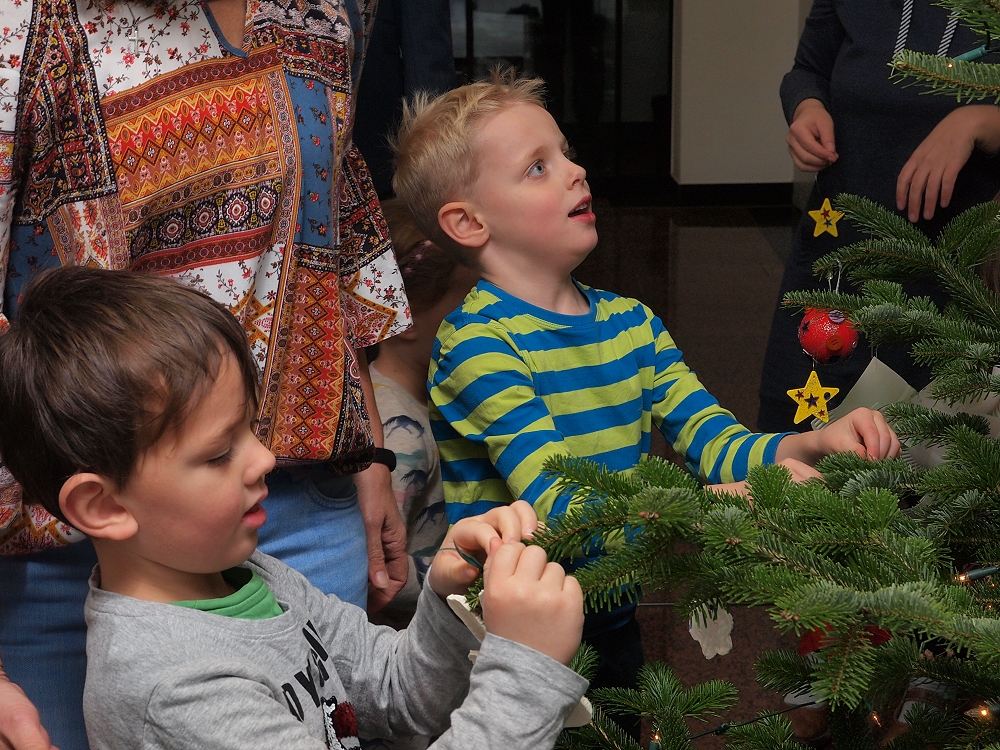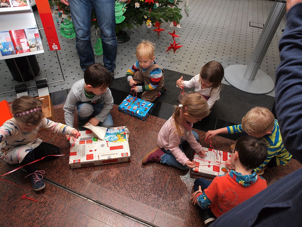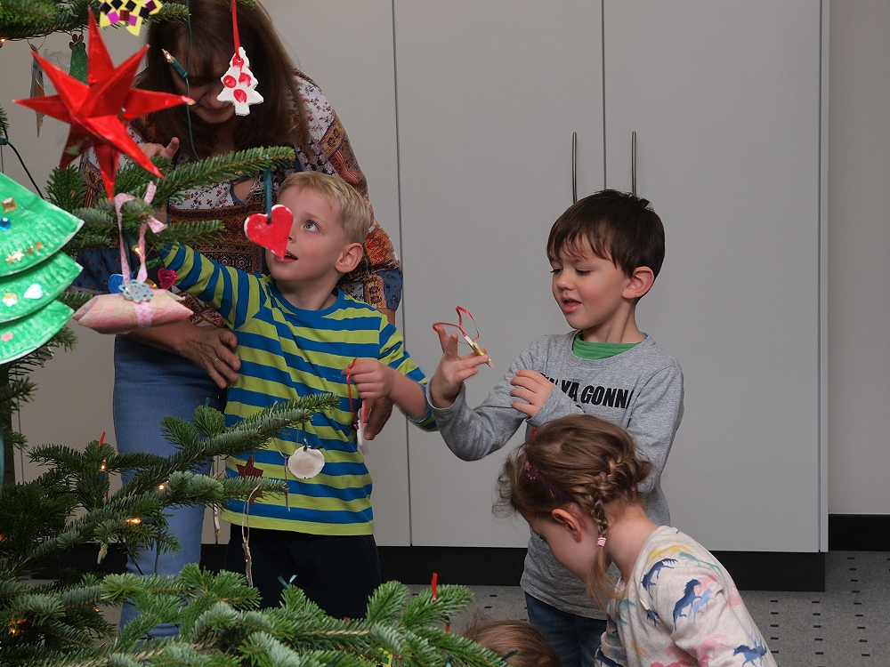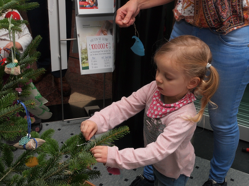 Viel Freude hatten die Kinder wieder beim traditionellen Weihnachtsbaumschmücken in der Geschäftsstelle der Sparkasse Rübenach. Mit etlichen Sternen und sonstigem selbst gebastelten Christbaumschmuck, verliehen sie dem frisch aufgestellten Tannenbaum einen festlichen Glanz. Jedes Ästchen wurde bedacht und wo die Kleinen nicht hin kamen halfen die Betreuerinnen und Betreuer der Kita und des Förderkreises entsprechend mit. Bei soviel Begeisterung konnte sich auch Geschäftsstellenleiter Christoph Neander nicht zurückhalten, um den einen oder anderen Stern mit aufzuhängen. Nach dem der Baum geschmückt war und von allen Beteiligten bewundert wurde, gab es als kleines Dankeschön von der Sparkasse dann noch eine Bescherung.