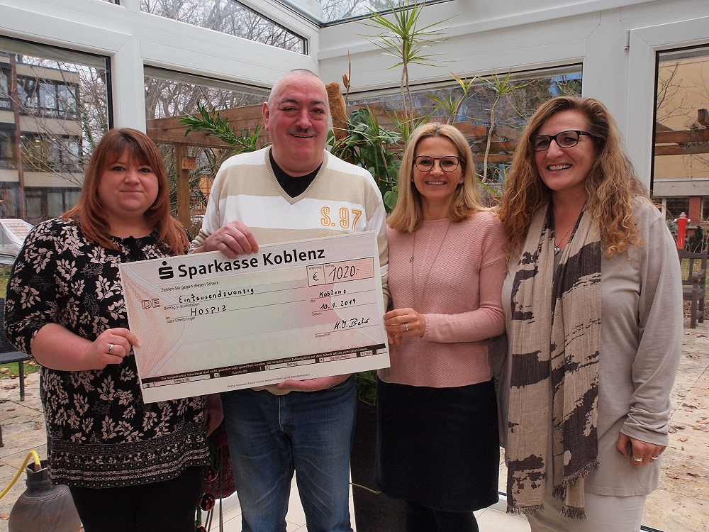 1020,- € kamen über eine Tombola bei der Kästchenssparer-Feier in der Gaststätte Brückerbach zusammen. Im vergangenen Dezember hatte Gastwirt Hans-Joachim „Dixi“ Behner seine Stammgäste zur Auszahlung eingeladen und eine Tombola zu Gunsten sozialer Zwecke organisiert. Rund 50 Gäste waren anwesend und beteiligten sich auch ausnahmslos zur Freude von „Dixi“ Behner und Tanja Fröhlich an der Tombola. Mit der symbolischen Scheckübergabe im Hospiz Koblenz an die Geschäftsführerin Luci Schmitz und Hospizleiterin Andrea Krahe fand die Aktion jetzt ihren Abschluss. Mehr über das Hospiz Koblenz siehe hier