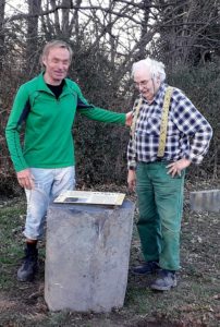 In der Silvesternacht wurde die Basaltsäule, die den nördlichen Eingang zum Jakobsweg durch Rübenach markiert, von einer launigen Partygruppe umgeworfen. Es muss sich dabei um eine Gruppe Weicheier gehandelt haben, denn wenn echte Kerle dabei gewesen wären, hätten die den Stein sicher wieder aufgerichtet nachdem sie nüchtern waren … Aber darauf wartete die Bürgerinitiative vergebens. So aber musste Wegewart Heinz Bengel, Andreas Perscheid um Hilfe bitten, der mit seinem Traktor den Stein wieder aufrichtete.