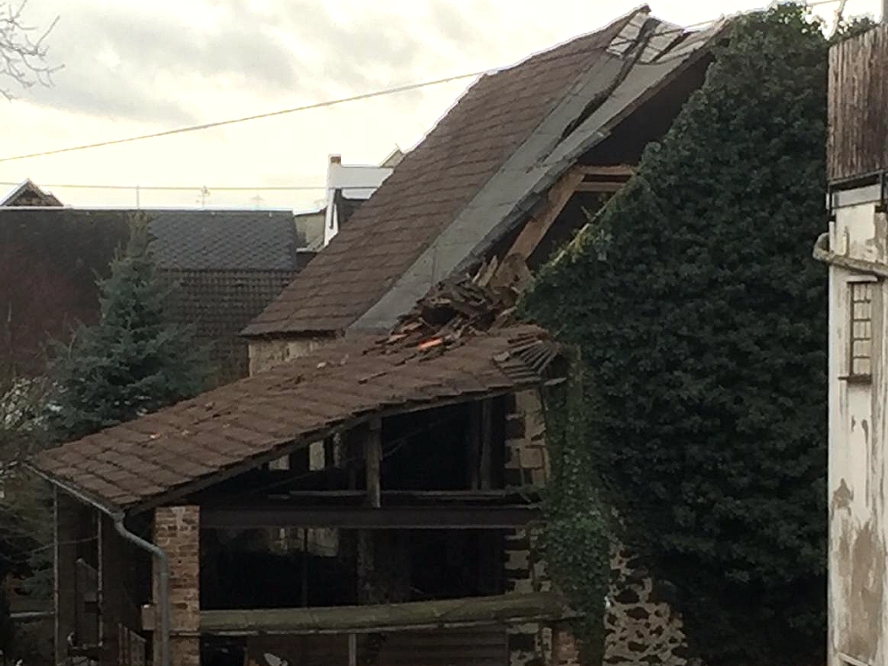An Freitagabend gegen 19:00 Uhr ist unter lautem Getöse ein Scheunendach in der Aachener Straße eingestürzt. Schon lange war die Dachfläche marode und es war nur eine Frage der Zeit bis es hier zum Einsturz kam. Der starke Sturm der letzten Tage hat ihm wohl jetzt endgültig den Rest gegeben. Zum Glück wurde niemand verletzt.