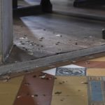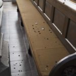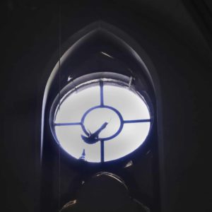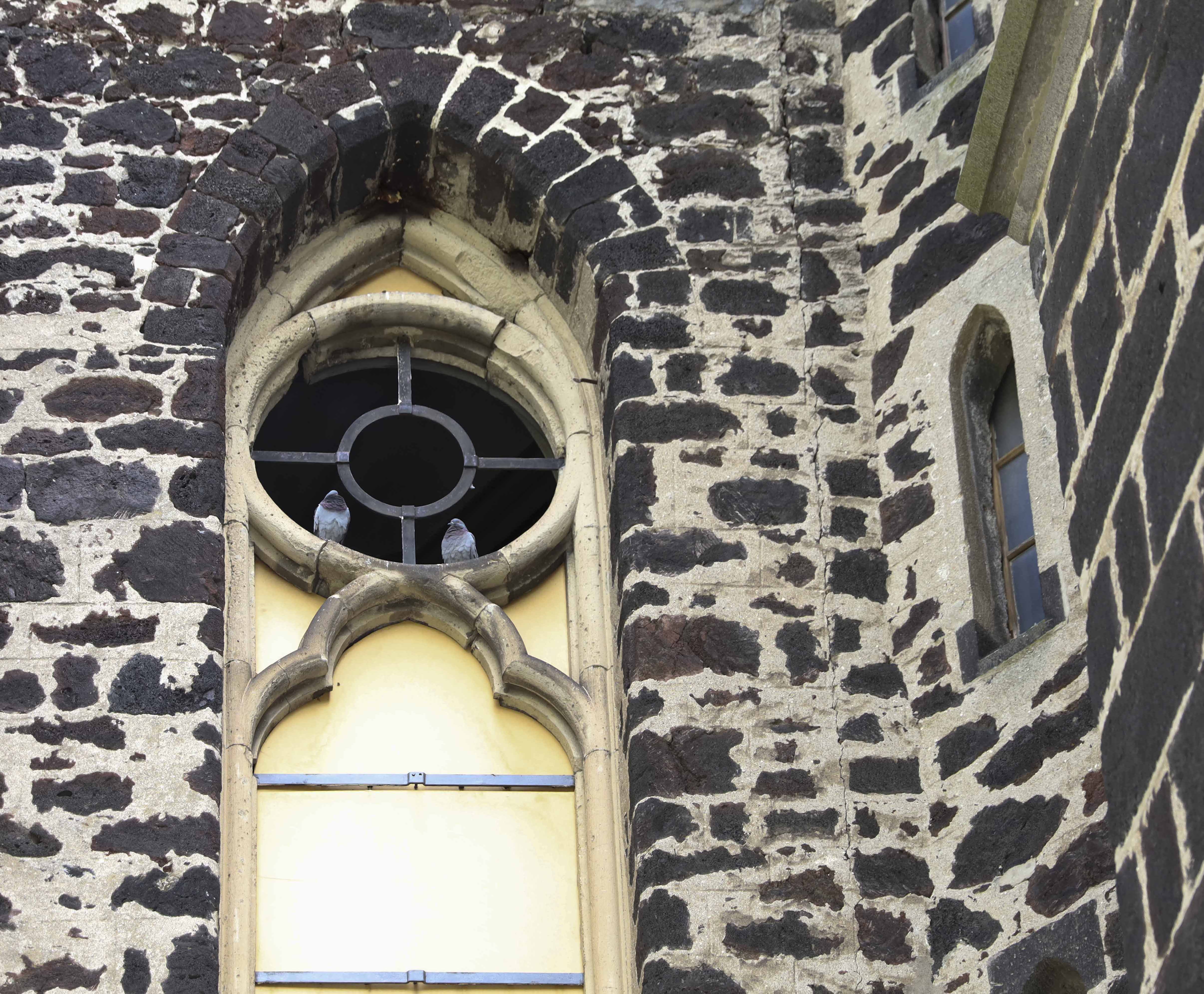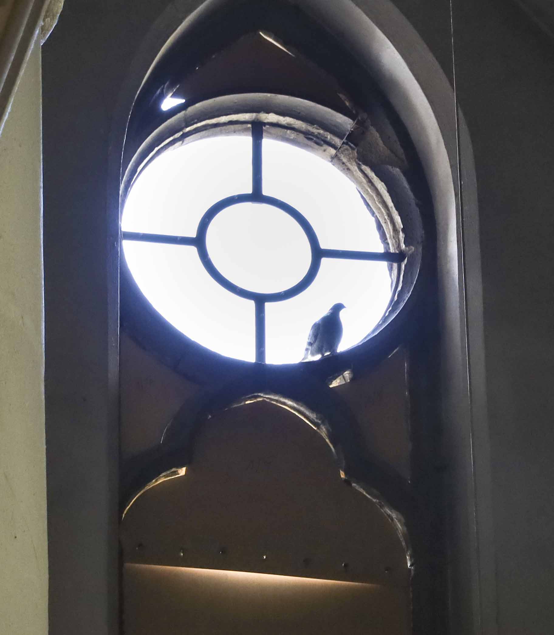 Im Gegensatz zu den Jüngern, die sich hinter verschlossenen Türen und Fenstern versammelt hatten, sind in unserer Kirche seit weit mehr als einem Jahr Tür und Tor im Seitenschiff geöffnet. Der untere Teil des hinteren Seitenfensters ist mit Sperrholzplatten „hermetisch“ abgeriegelt, die Rosette jedoch hat man offengelassen, damit der Heilige Geist eine freie Einflugschneise hat, wenn er wie heute auf den Punkt landen muss.