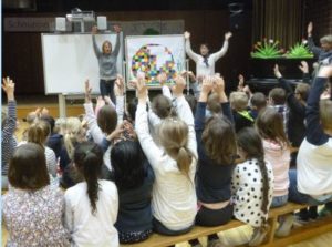 Am 7. und 8. Mai waren über 60 Vorschulkinder zu Besuch in der Grundschule Rübenach. Gemeinsam wurde in der Aula „Elmar“ vom Autor David McKee als Bilderbuch-Kino angeschaut und anschließend arbeiteten die Vorschulkinder und die Erstklässler gemeinsam in einer Elmar-Werkstatt in den Klassenräumen der 1a, 1b und 1c. Zusammen wurde eifrig gebastelt und gemalt. Auch eine richtige Schulhofpause konnten die Kinder miteinander verbringen. Zum Schluss trafen sich alle wieder in der Aula und verabschiedeten sich mit einem gemeinsamen Lied.