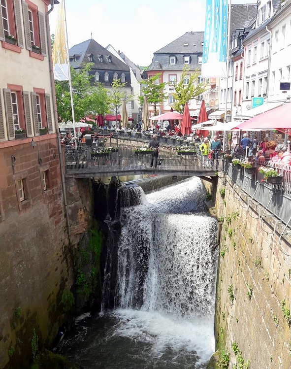 Weiter ging es nach Saarburg Das Saarufer mit Blick auf die Burg und die Innenstadt von Saarburg mit dem fast 20 m in die Tiefe stürzenden Wasserfall des Leukbachs und seinen kleinen Brücken und der Marktplatz laden zum Schlendern und Verweilen ein. Einige Frauen nutzten auch das kleine Bähnchen um die Stadt zu erkunden. Unsere nächste Station war Mettlach mit der bekannten Keramikfirma Villeroy& Boch. Neben dem Hauptgebäude des Werks im Abteipark steht der vor über 1000 Jahren erbaute „Alte Turm“. Ganz in der Nähe sind zwei Kunstwerke der EXPO 2000 zu bewundern. Das Outlet-Center mit dem schönen Geschirr verführte zum Einkaufen.