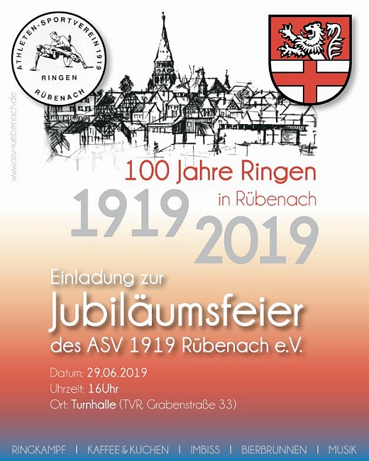 Der Athleten-Sportverein 1919 Rübenach e.V. feiert in diesem Jahr sein 100-jähriges Bestehen. Die Jubiläumsfeier findet am Samstag, den 29.06.2019 ab 16:00 Uhr in der Turnhalle des TV Rübenach statt. Während der Sonntagsmesse, am 16.06.2019 um 9:30 Uhr wird unsere Vereinsfahne in der Pfarrkirche St. Mauritius gesegnet. Wir laden dazu ein und freuen uns, Euch alle an diesem Ehrentag begrüßen zu dürfen.