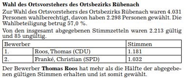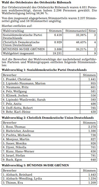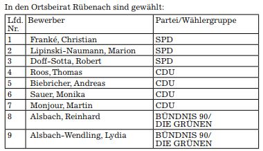 Bekanntmachung der Ergebnisse der Kommunalwahlen. Der Wahlausschuss hat in seiner Sitzung am 31. Mai 2019 die Ergebnisse der Kommunalwahlen wie folgt festgestellt: