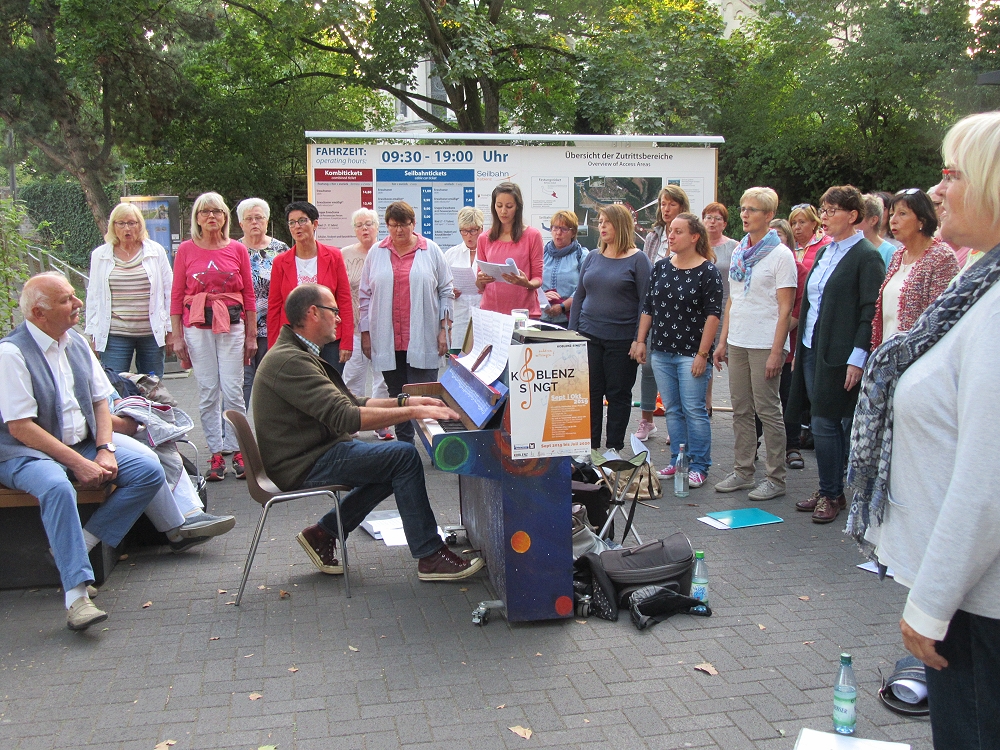 Gemeinsam mit dem Kulturamt der Stadt Koblenz und der Koblenz Touristik startete der Frauenchor Quodlibet am Dienstag, den 3. September die Aktion “ Koblenz singt “ und präsentierte eine Öffentliche Chorprobe an der Seilbahn. Chorleiter Wolfgang Fink begeisterte nicht nur die 40 Sängerinnen sondern motivierte auch die Zuhörer zum Mitsingen und mitklatschen.