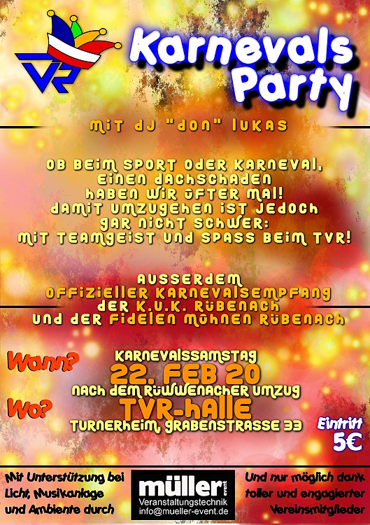 Bevor es jedoch sportlich in der Halle wieder losgeht, ist erst einmal großes Reinemachen angesagt. Die Reparaturarbeiten haben reichlich Schmutz hinterlassen. Außerdem steht am Samstag, den 22. Februar die große TVR Karnevalsparty an. Die Vorbereitungen hierzu laufen bereits auf vollen Touren, so Vereinsvorsitzender Torsten Mannheim. Unter dem Motto: „Ob beim Sport oder Karneval, einen Dachschaden haben wir öfter mal! Damit umzugehen ist jedoch gar nicht schwer, mit Teamgeist und Spaß beim TVR!“, lädt der Verein das närrische Volk nach dem Umzug zum Abfeiern ein.