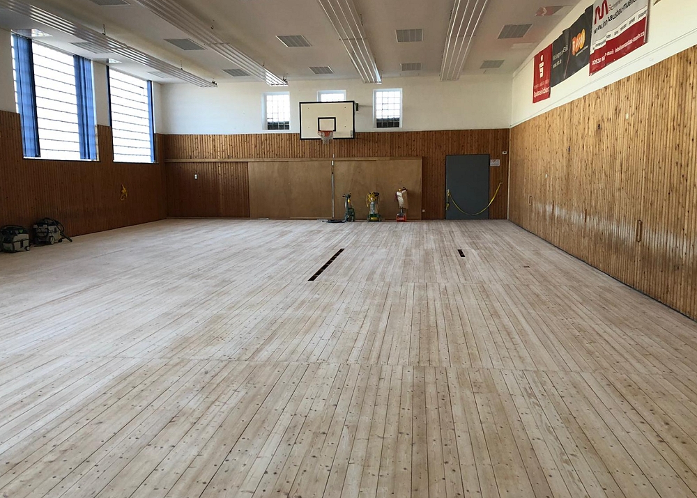 Corona und freie Kapazität der Firma Schreinerei Müller machte es möglich, noch im Rahmen der Kontaktsperre mit den Arbeiten zu beginnen. Seit Montag 4. Mai wird nun in der Halle gewerkelt. Zirka 14 Tage wird die Sanierung mit Austausch von Einzelplanken, Abschleifen des Bodens und anschließender Versiegelung in Anspruch nehmen. Ab dann könnten die Vereinsmitglieder (sofern Corona begingt erlaubt) auf einem wieder optimal hergestellten Hallenboden ihren Sportaktivitäten nachgehen.