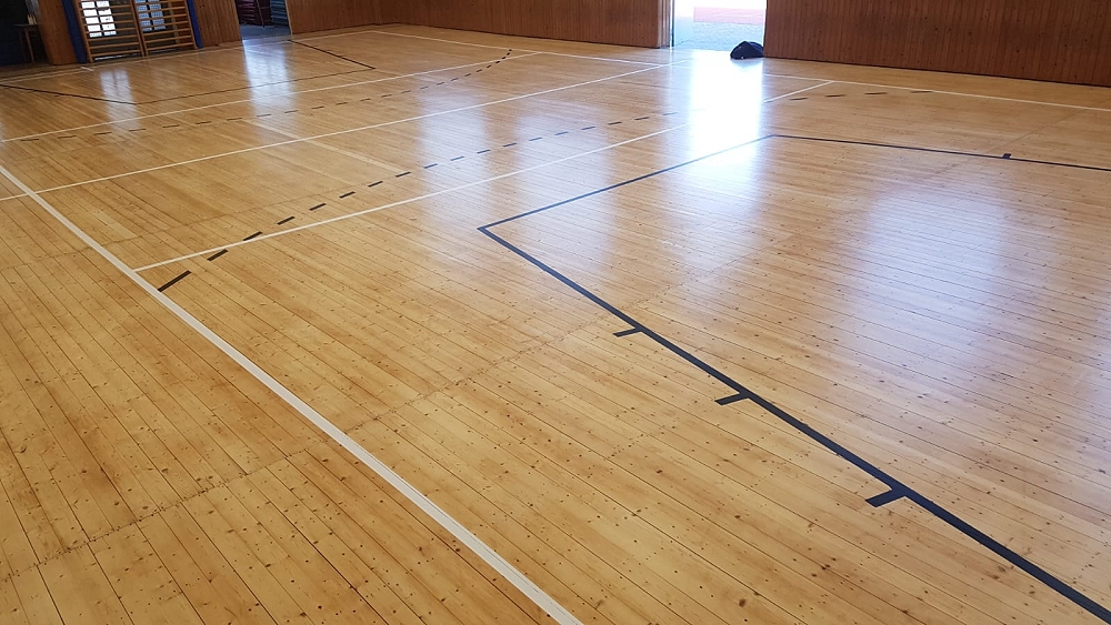 Knapp 1 ½ Wochen haben die Arbeiten in Anspruch genommen. Wie schon berichtet, wurden marode Holzdielen ausgewechselt, der Boden abgeschliffen und anschließend wieder neu versiegelt. Auch die Spielfeld-Markierungen für Volleyball und Basketball wurden erneuert.