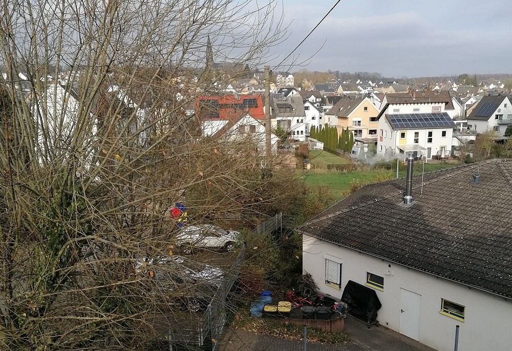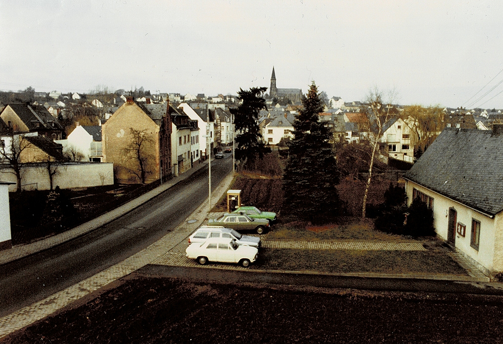 In den 1970er Jahren befand sich an der heutigen Stelle der städtischen Kindertagesstätte „Im Zauberland“ das Gemeindehaus und die anschließende Ortsverwaltung Rübenach. Neben der Parkfläche davor befand sich noch eine von ehemals vier Telefonzellen im Ort. Durch einen Baum ist die Sicht auf die Lambertstraße aus dieser Perspektive inzwischen (2023) eingeschränkt.