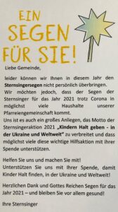 In der Postagentur, der Bäckerei Lohner, der Sparkasse und der Volksbank, werden in dieser Woche noch Segen ausgelegt und Spendendosen aufgestellt. Sollte jemand keine „Sternsingerpost“ vorfinden, kann er nebenstehenden Text herunterladen.