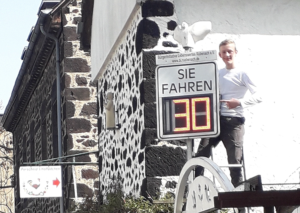Das Verkehrsmessgerät der BI „Lebenswertes Rübenach“ ist inzwischen etwas in die Jahre gekommen. Die neuen Geräte heute zeigen ein lachendes Gesicht, wenn man unterhalb der Geschwindigkeitsbegrenzung bleibt und ein böses Gesicht, wenn man zu schnell fährt.