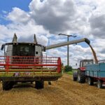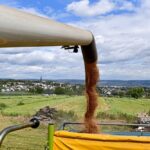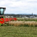 Gedroschenes Stroh wird gehäckselt und als Naturdünger auf dem Acker verteilt