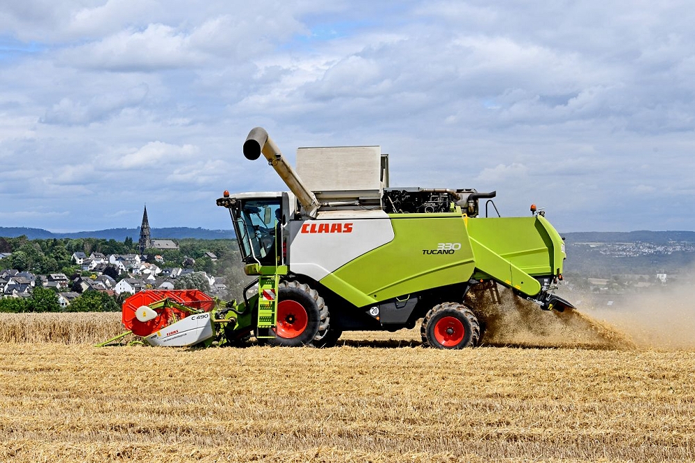Wenn Sonne und Wind das Getreide getrocknet haben, sind die Mähdrescher auch in unserer Gemarkung unterwegs. Die nachfolgenden Bilder zeigen den Einsatz eines „Claas TUCANO 330“, der vom Rübenacher Udo Härter durch das Getreide gesteuert wurde.