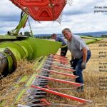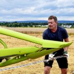 Unterbrochen wurde die Mäharbeit durch eine verloren gegangene Messerklinge. Der über vier Meter lange Messerbalken musste aus dem Schneidwerk gezogen werden, um eine neue Klinge mit Senknieten zu befestigen.