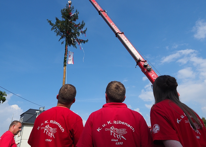 … und wartet vergebens auf Kirmesbesucher am kommenden Wochenende. Dank der K.u.K. und Unterstützung der Freiw. Feuerwehr, wurde der Kirmesbaum 2021 am Samstagnachmittag mit Hilfe eines Kranwagen auf dem Schulhofparkplatz aufgestellt. Auch wenn sich so gut wie keine Besucher unter ihm scharen werden, die Möck als äußeres Zeichen grüßt ungeachtet dessen alle Kirmesfans.