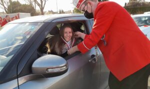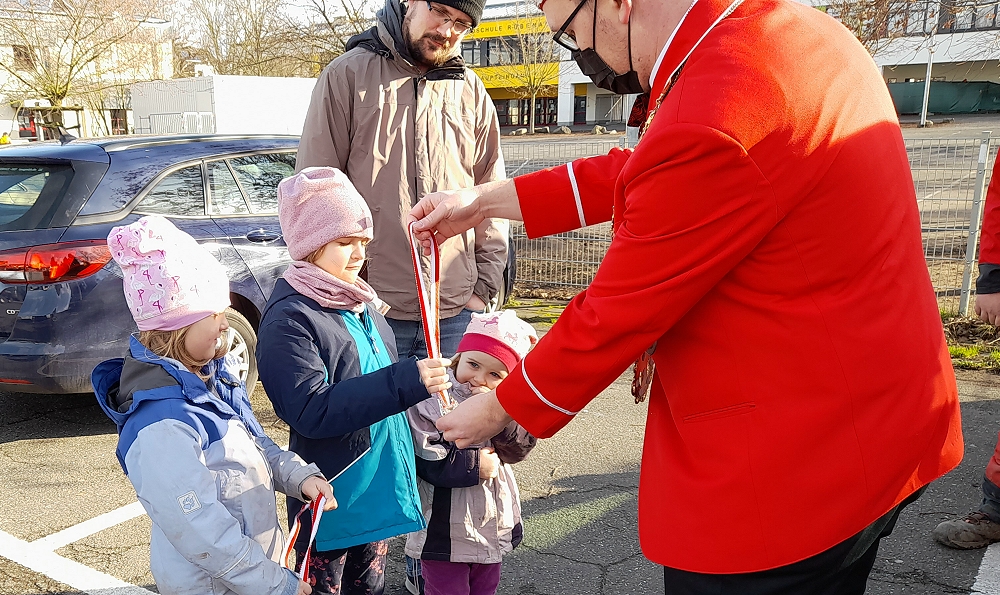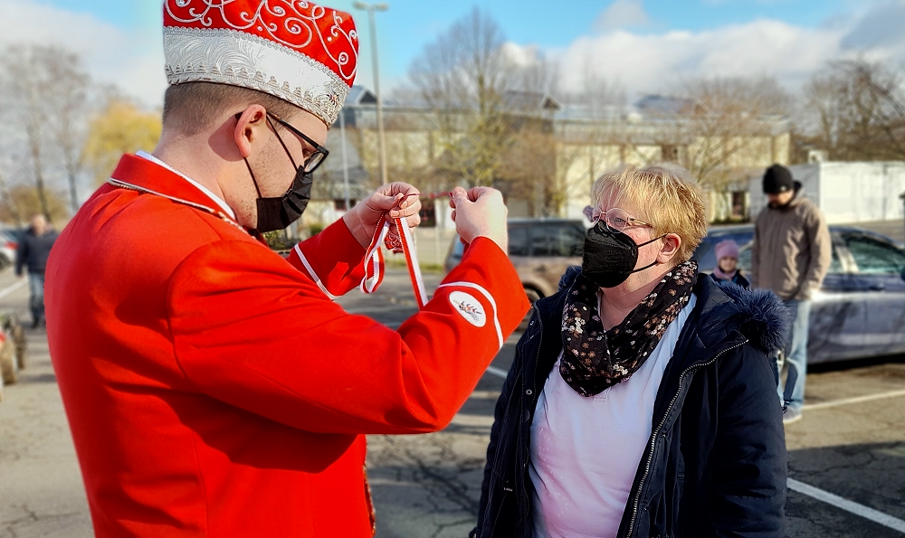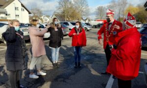 … Am Nachmittag ging es dann weiter auf den Parkplatz vor der Grundschule. Dort wurden aktive Mitglieder, Gruppierungen und alle Unterstützer und Förderer unseres Vereins eingeladen, in einer Drive-In-Aktion zwischen 14:00 Uhr und 17:00 Uhr den diesjährigen Sessionsorden in Empfang zu nehmen. Viele waren gekommen und so konnten wir heute rund 80 Orden an Groß und Klein überreichen. Siehe auch Website K.u.K. Rübenach