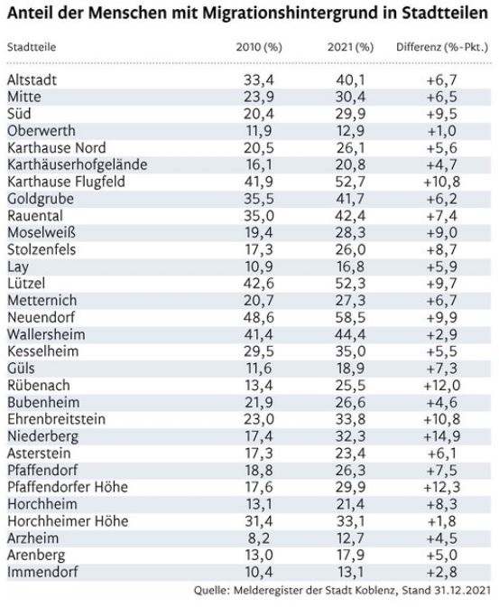 Jeder dritte Koblenzer hat eine Migrations- oder Fluchtgeschichte – ist also selbst im Ausland geboren oder hat mindestens einen zugewanderten Elternteil. In Zahlen sind das 37 848 Menschen (Stand 31. Dezember 2021). Im Detail sind davon 20 652 deutsche Staatsangehörige mit Migrationshintergrund und 17 196 Ausländer.