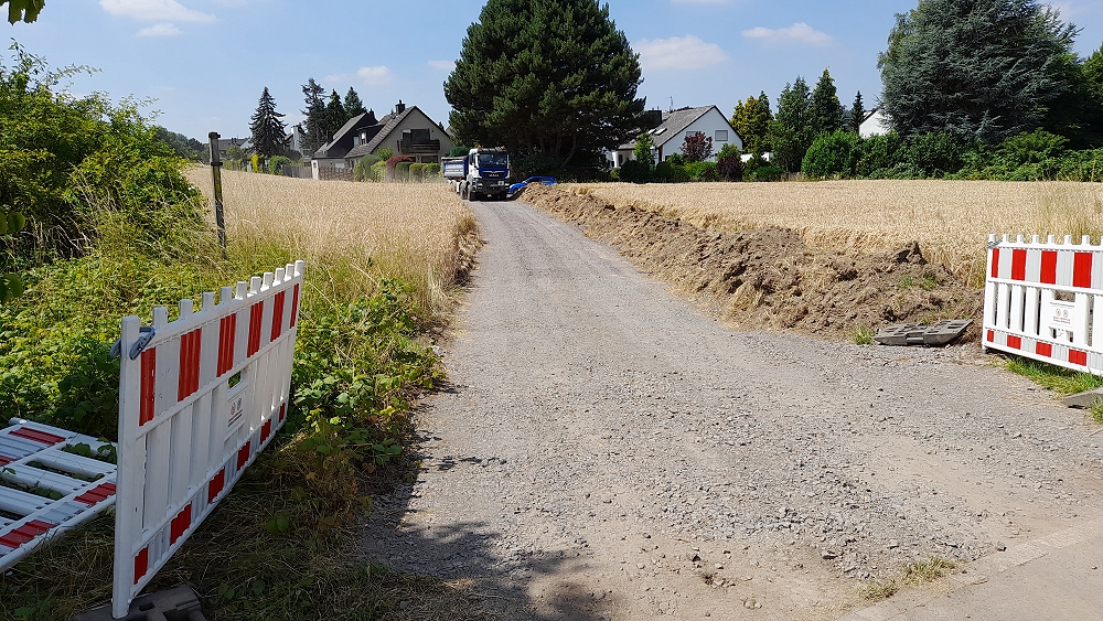 Dem einen oder anderen wird es schon aufgefallen sein, unmittelbar am ehemaligen Bahnübergang Aachener Straße von Koblenz aus kommend, wurde ein Weg zum Wirtschaftsweg geschoben. Nach Auskunft von Ortsvorsteher Thomas Roos ist dies nur eine temporäre Baustraße, die für Baufahrzeuge im Zuge der neu verlegten Wasserleitung zum GVZ hin genutzt wird. Eine dauerhafte Abkürzung, wie sie hier immer wieder fußläufig über das Feld getrampelt, wird ist nicht vorgesehen.