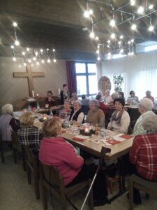 Am 07. Dezember 2022 haben sich die Seniorinnen und Senioren aus Rübenach, im ev. Gemeindezentrum, nach 2 Jahren Corona-Pause, wieder einmal zu einem ökumenischen Adventsnachmittag eingefunden. Pfarrerin Marina Stahlecker-Burtscheidt von der ev. Kirchengemeinde, Pastor Herbert Lucas von der kath. Pfarrei und meine Wenigkeit (Inge Becker) sorgten für einen geselligen und besinnlichen Nachmittag.
