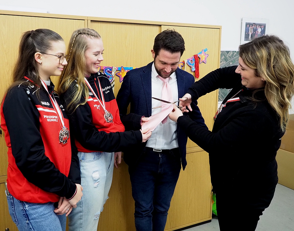 Dabei gingen die K.u.K. Damen beim Besuch in der Ortsverwaltung Ortsvorsteher Thomas Roos mal so richtig an den Kragen, sprich Schlips. Ein kurzer Schnitt mit der Schere und schon wurde unter freudigem Beifall der Rest vom guten Stück als „Trophäe“ siegreich in die Höhe gereckt.