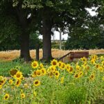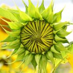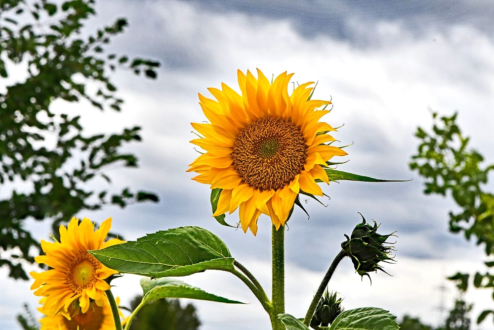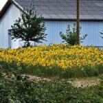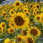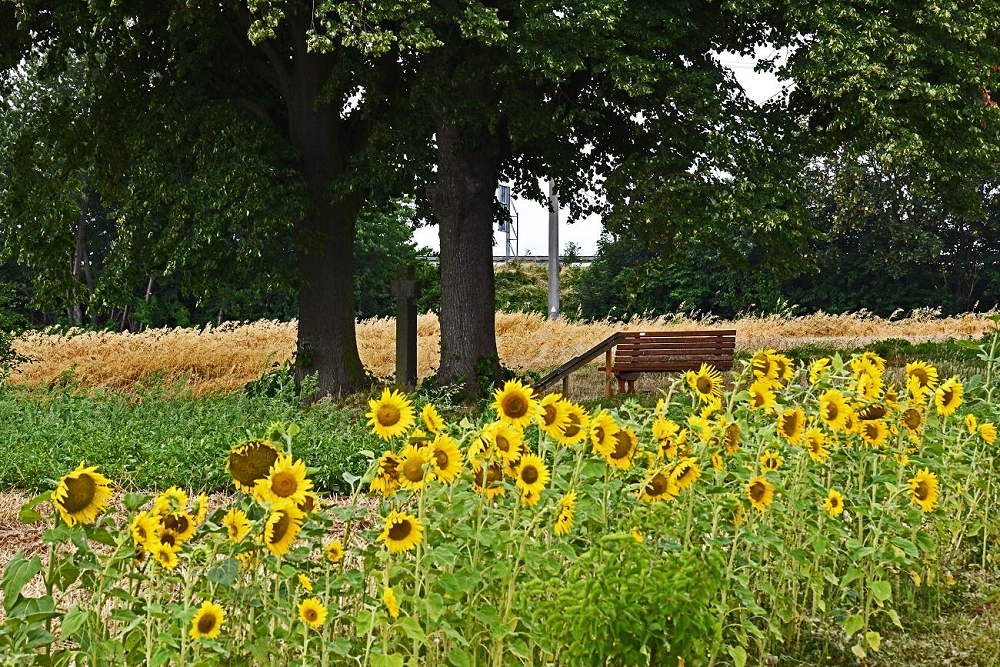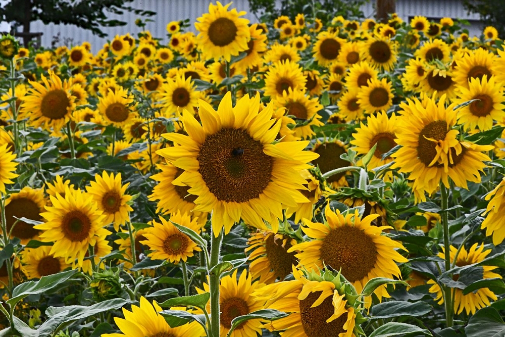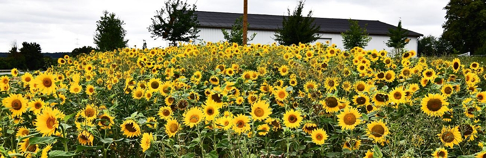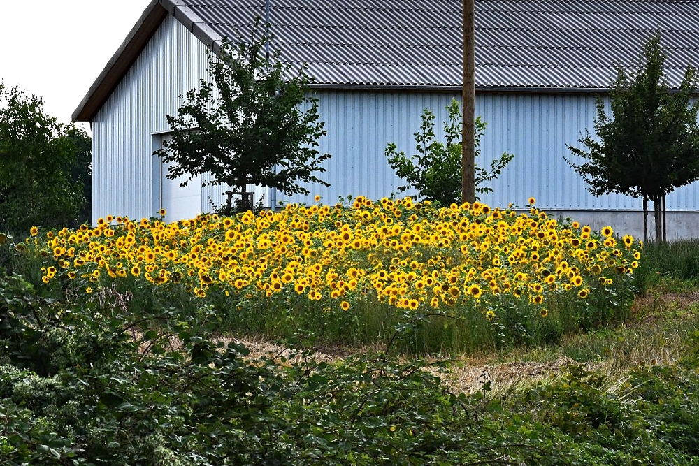 Trotz Wind, Regen und wenig Sonne blühen die Sonnenblumen in voller Pracht. Zu sehen ist ein Blumenfeld rechts des Weges, wenn man von Rübenach Richtung Bassenheim fährt. Es ist ein Eldorado für Bienen und Hummeln. Die Blütenkörbe sind mit tausenden Röhrenblüten gefüllt. Eingerahmt von leuchtend gelben Blütenblättern bilden die Blüten in den Blütentellern die verschiedensten Formen und Farben.