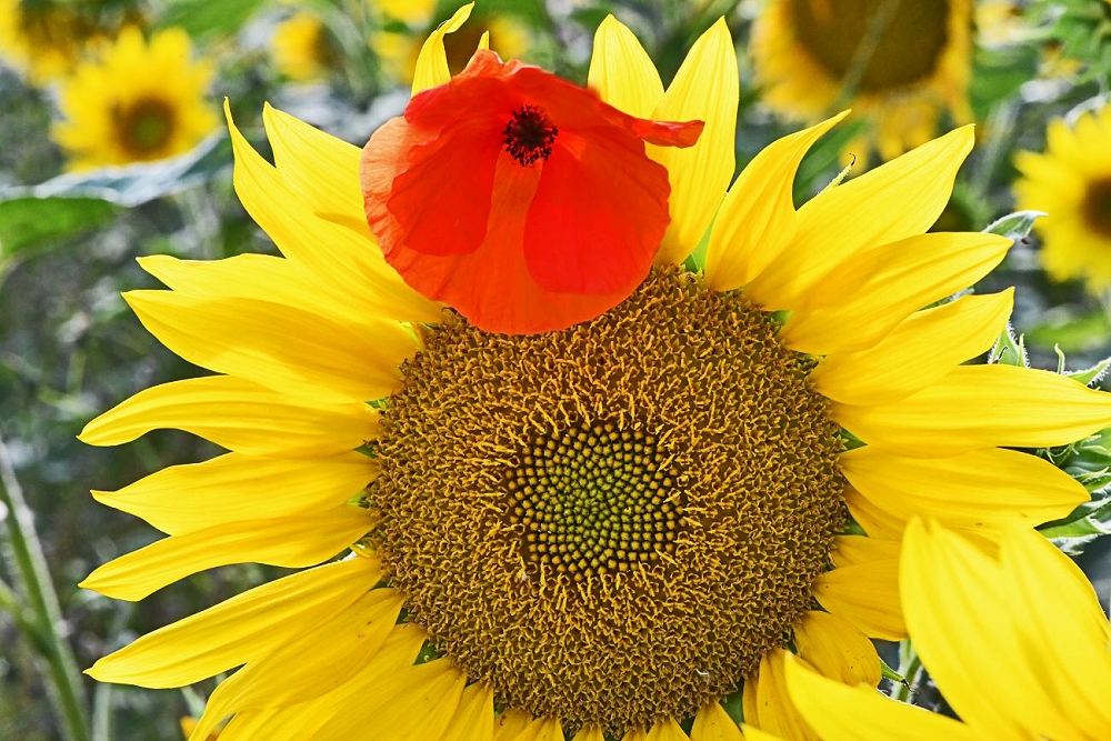 Wenn die Sonnenblumenkerne reif sind, ist das Feld ein Schlaraffenland für Vögel. Die Sonnenblume ist eine der beliebtesten Blumen. In der Kunst ist sie insbesondere bekannt als „Sonnenblumen in der Vase“ von Vincent van Gogh. Sie gilt als Zeichen der Hippiebewegung und Erkennungssymbol der Partei Bündnis 90/Die Grünen.