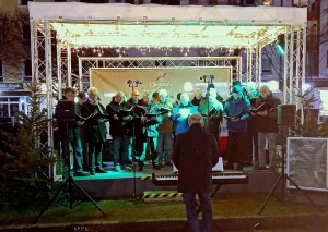 Seit einigen Jahren gestalten die Chöre des Kreis-Chorverbandes Koblenz den „Klingenden Adventskalender“ auf dem Koblenzer Weihnachtsmarkt. Als das 20. Türchen geöffnet wurde, erklangen die Stimmen des Männerchores Rübenach. Mit unserem weihnachtlichen Repertoire wollten wir die Besucher in besinnliche Feierstimmung geleiten. Das gelang dann auch wirklich, als wir mit den Zuhörern gemeinsam die traditionellen Weihnachtslieder sangen.