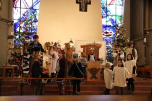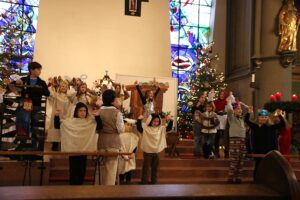 Schon war der 24. Dezember gekommen und wir fragten uns, ob die eine Woche „Werbung“ für das Krippenspiel ausgereicht hatte, um die Familien in Rübenach zu erreichen. Ja, es hatte gereicht. Die St. Mauritius Kirche war um 15:00 Uhr gefüllt mit vielen Familien, alle festlich gekleidet in großer Erwartung auf die Krippenfeier.