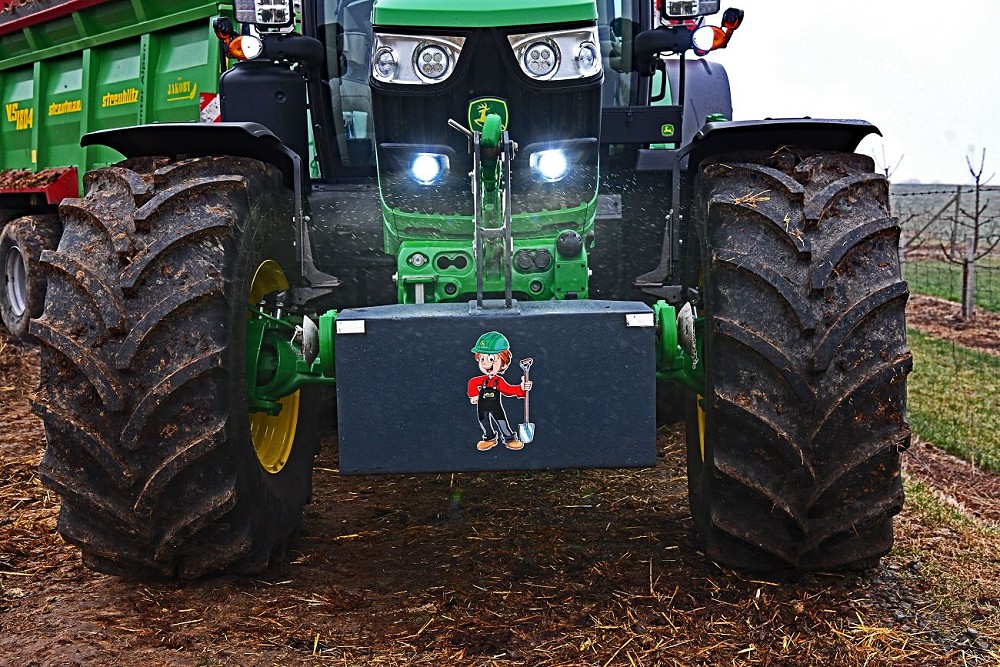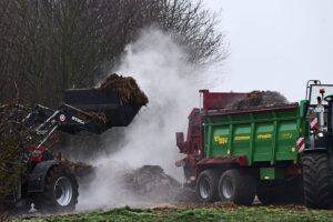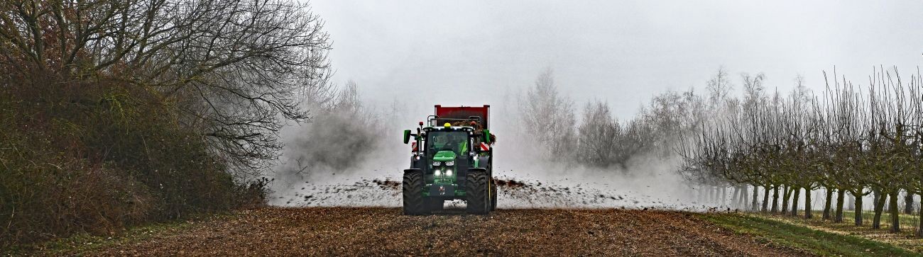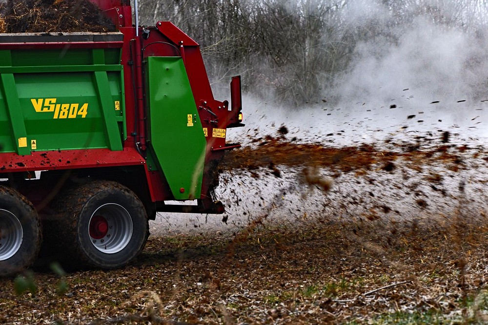 Das trifft auch für das Ausbringen des Stalldungs durch Einsatz eines modernen Miststreuers zu. Er wird über ein Bedienterminal im Traktor gesteuert, hat ein Ladevolumen von ca. 16 Kubikmeter und kann in wenigen Stunden Tonnen von Festmist verteilen. Die Dosierung der Mistmenge und die Ausbringungsbreite (bis ca. 20 m) kann variiert werden.
