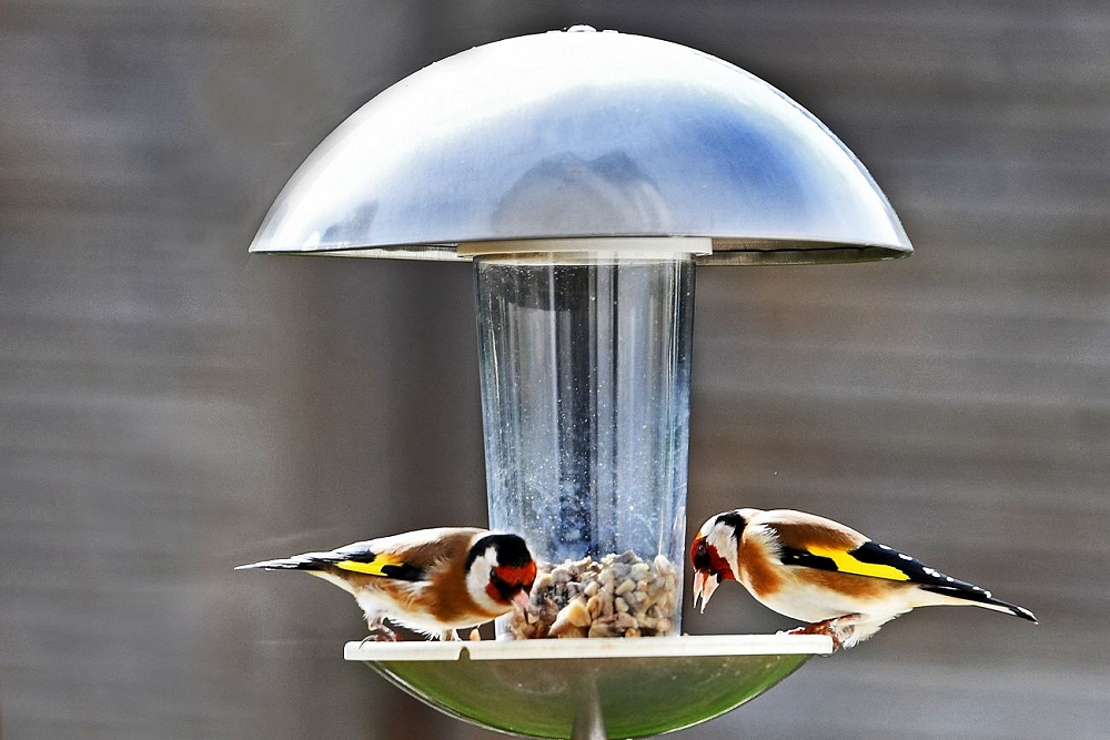 Nicht nur Spatzen und Meisen sind Futtergäste an der Vogelfutterstation, sondern auch ein Stieglitzpärchen lässt es sich schmecken. Guten Appetit!