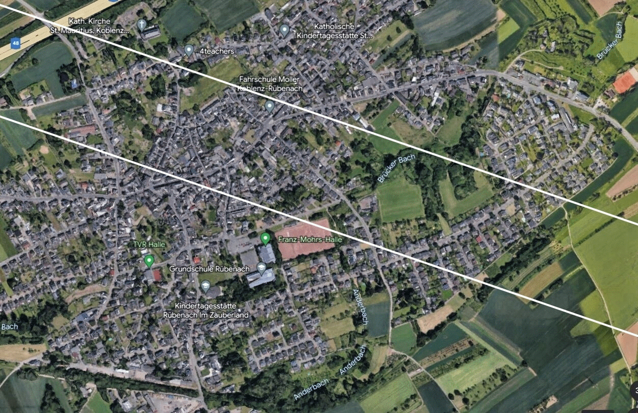 Wie jetzt bekannt wurde, sollen im Rahmen der Erhöhung des Flugverkehrs sogenannte „Flugsicherungs-Leuchtfeuer“ (ähnlich denen auf Flughäfen) auf Flugrouten bodennah installiert werden. Nach vorliegenden Informationen durch die DFS (Deutsche Flugsicherung GmbH) sowie der Pilotenvereinigung Cockpit würden von daher in Rübenach bis zu sieben Hochleistungs-Leuchtstrahler mit jeweils 150 000 Lumen positioniert. Betroffen davon sind in einem Korridor von 150 bis 200 Meter Breite (siehe Animations-Grafik) die Straßenbereiche: Oberer Bassenheimer Weg, Alemannen- und Mauritiusstraße, Goten- und Von-Eltz-Straße, Aachener Straße, Mühlenstraße bis Keltenstraße.