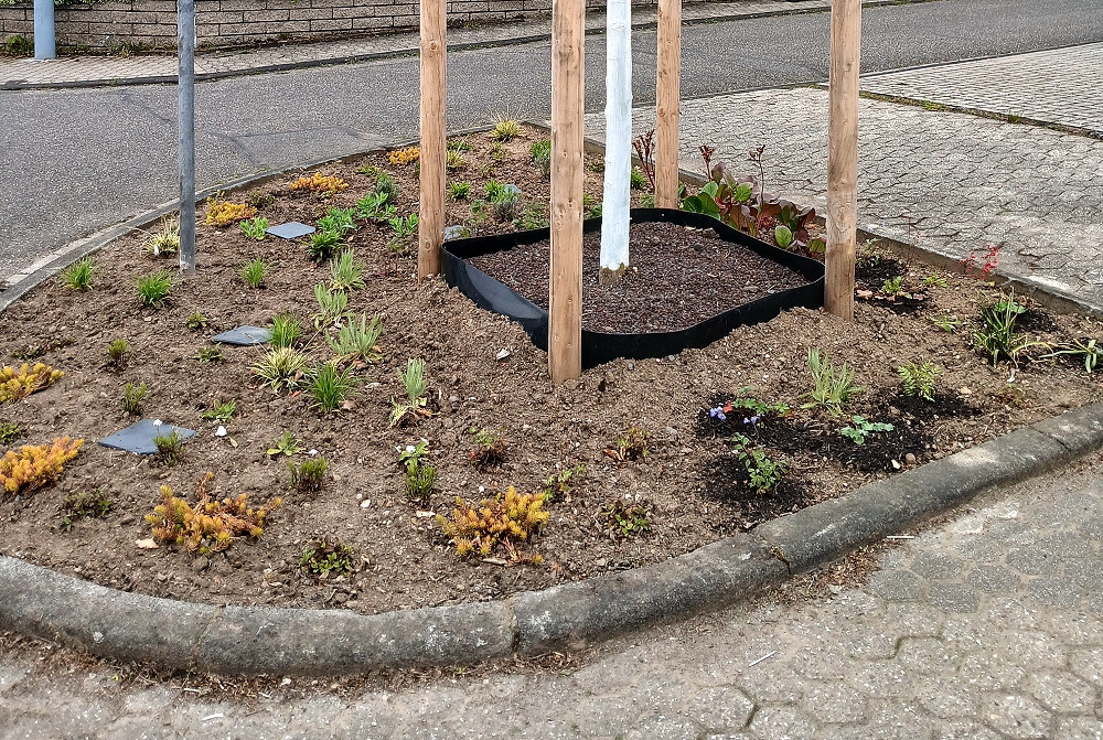 Nachdem im Spätherbst in der Keltenstraße eine Baumscheibe neu mit einer Ulme bepflanzt wurde, weil die alte Linde entfernt werden musste, bekam die Baumscheibe nun auch noch eine neue Unterpflanzung. Eine Anliegerin hatte bei der Stadt nachgefragt, ob das Baumbeet denn nicht eine hübsche Ausstattung mit blühendem Flor erhalten könne und sich bereit erklärt, eine Patenschaft für das Beet zu übernehmen.