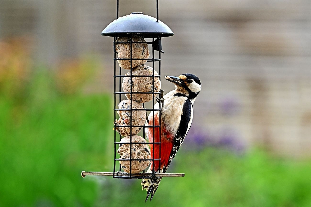 Ein Buntspecht tut sich gut am Meisenfutter …